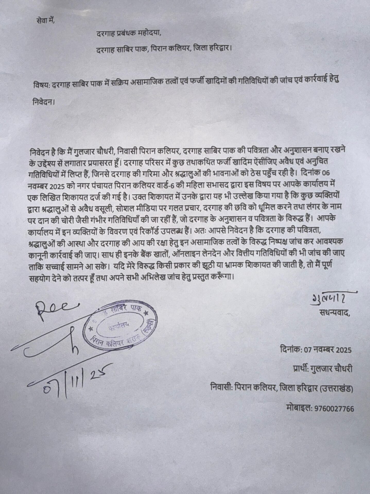 भीम आर्मी कलियर नगर अध्यक्ष गुलजार चौधरी ने दरगाह प्रबंधक को एक साहसिक लिखित शिकायत/निवेदन प्रस्तुत किया है, जिसमें दरगाह की गरिमा की रक्षा के लिए तत्काल निष्पक्ष जांच और कड़ी कानूनी कार्रवाई की मांग की गई है।गुलजार चौधरी ने दरगाह की पवित्रता बनाए रखने की लड़ाई में आगे आते हुए, इन असामाजिक तत्वों के ख़िलाफ़ निर्णायक कदम उठाने पर ज़ोर दिया है।