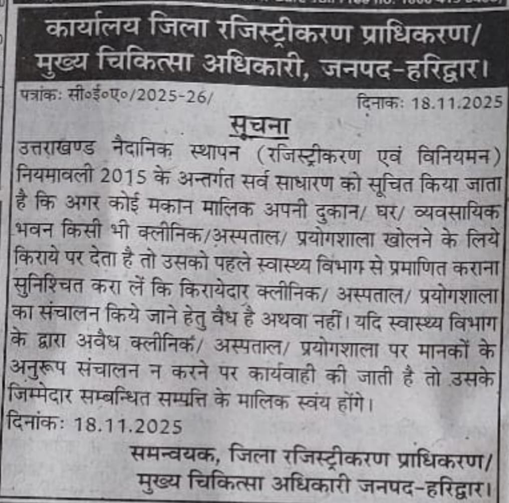 Property in Haridwar अवैध रूप से चल रहे अस्पतालों और पैथोलॉजी लैबों के खिलाफ स्वास्थ्य विभाग ने अब कड़ा रुख अख्तियार कर लिया है। विभाग ने एक नया और सख्त आदेश जारी किया है, जिसके तहत अब संपत्ति मालिकों को अपनी दुकान, मकान या व्यावसायिक भवन किसी भी अस्पताल, प्रयोगशाला या क्लीनिक को किराए पर देने से पहले ‘नो ऑब्जेक्शन सर्टिफिकेट’ (NOC) लेना अनिवार्य होगा।